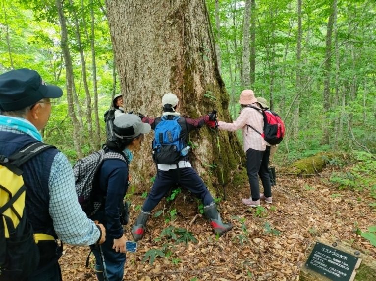 みんなで手を繋いで囲ってみると大人4人分はありました。福士さん曰くおそらくこの木は周囲のミズナラの親なのだそう…。