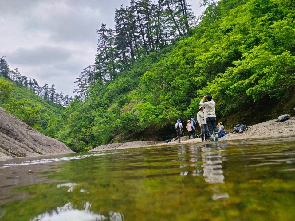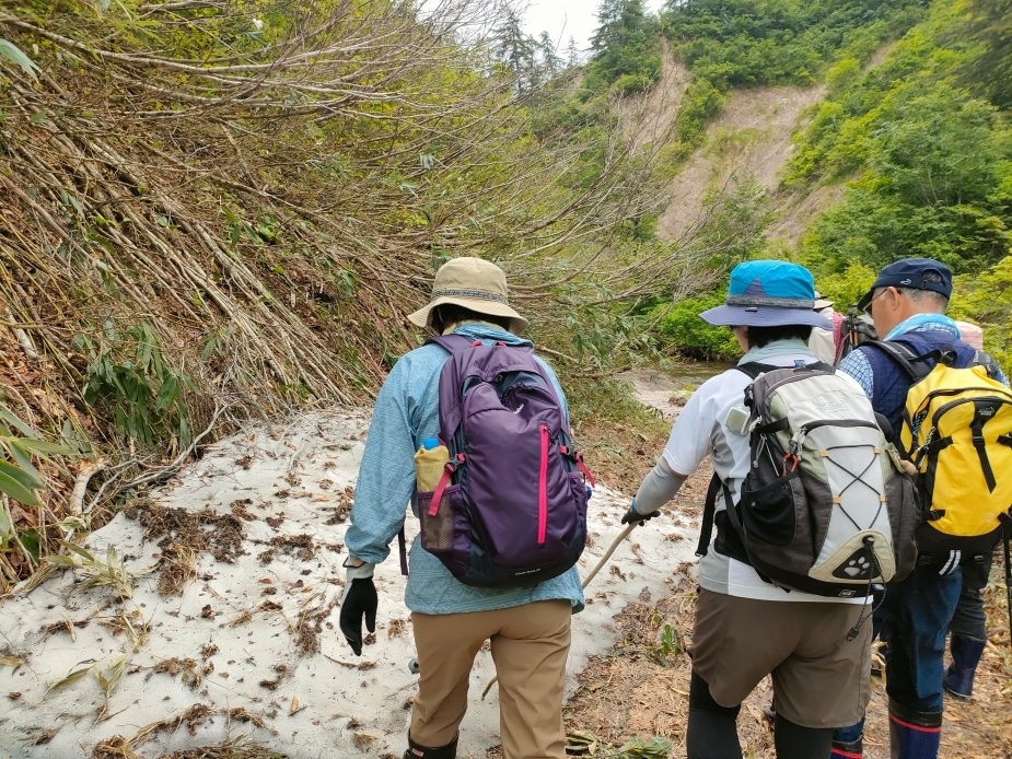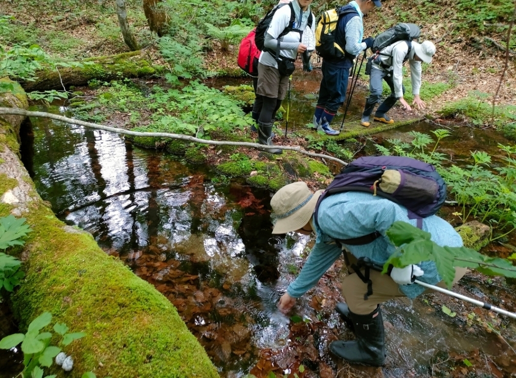 森を抜け、桃洞沢に出ました。沢はこのツアー数日前にやっと雪が解けたのでまだ春のような植物や花が見られます。