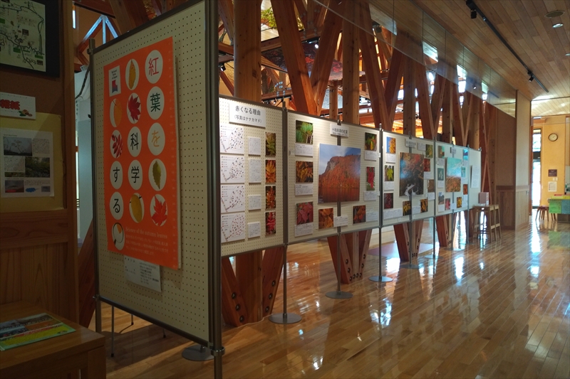 企画展示では、十和田湖、奥入瀬渓流、八甲田山の鮮やかな紅葉の写真を掲示し、景色を構成する樹木や色付きのしくみについて解説しています。紅葉の景色を見る前や見た後にお寄りください。実際の景色を見たときの感動や興味がより増すと思います。