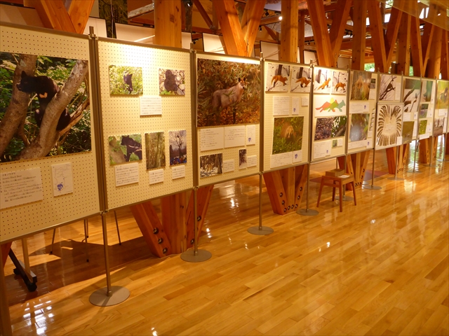 企画展示では、森の中に隠れていてなかなか見られない動物や鳥を知ってもらおうと思い、動物や鳥、全22種の写真を中心にしつつ、「クマタカの羽」などの実物展示もしています。写真は、自然公園財団十和田支部の皆さんや当事務所の職員が撮りためたもので、いずれもなかなかの迫力の写真ばかりです。子供たちにも分かりやすい展示、解説を心がけました。夏休み期間中のご家族での来館お待ちしております。
