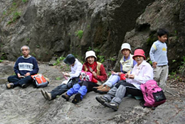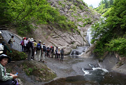 例年であれば、今の時期は雪解け水で水量の多い桃洞の滝も、今冬の雪が少なかったせいか水量が少なかったが、滝を目の当たりにした参加者から「ワァーッ」という歓声があがっていました。