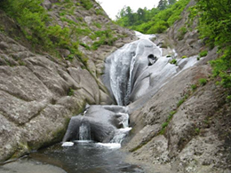 ノロ川遊歩道から桃洞沢沿いに500メートルほどで渓谷のシンボルとなっている桃洞の滝に到着です。