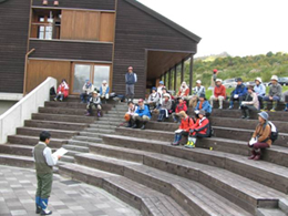 森吉山野生鳥獣センター構内のレクチャー広場は、クマゲラの棲む森を見ながら説明が受けられるようにつくられた施設。ここでオープニングを行った