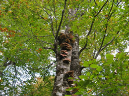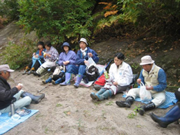 自然観察会の舞台となる森吉山麓高原の紅葉は、例年より1週間ほど遅れているとのことですが、標高900mから上はきれいに色づいて盛りを迎え、森吉山野生鳥獣センターのある標高650m付近はブナが黄色く色づいてきたというところでした。赤水渓谷は、清流に青い空、木々が様々に色づいて「天国の散歩道」にふさわしい景観でした。