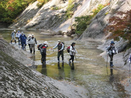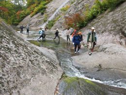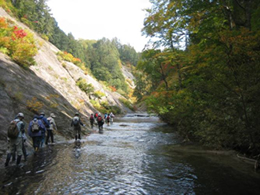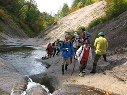 甌穴と深みを避けて、一枚岩のうえを流れる水の中を歩く。渓谷の紅葉は見頃には少し早いが、清流に写して美しい