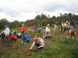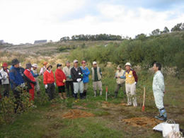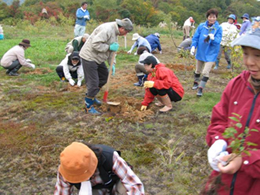 牧場として開発された区域をブナ林に再生しクマゲラの棲める森をつくるため、秋田県は森吉山麓高原自然再生事業に取り組んでいます。この一環で自然環境学習としてブナの植樹を体験しました