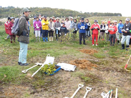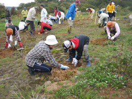 クマゲラが棲める立派なブナ林に育つことを祈って、力を合わせて植樹。自分の植えた苗がどうなっているか生長を見るのが楽しみという声